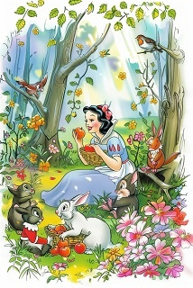Представьте себя на месте Белоснежки, сидящей на лесной поляне среди своих друзей-гномов и лесных животных. Какие чувства и мысли у вас возникают? Какую поддержку вы получаете от своих друзей и природы? Запишите свои размышления и подумайте, как этот образ можно применить в вашей реальной жизни, чтобы стать более гармоничным и добрым человеком.